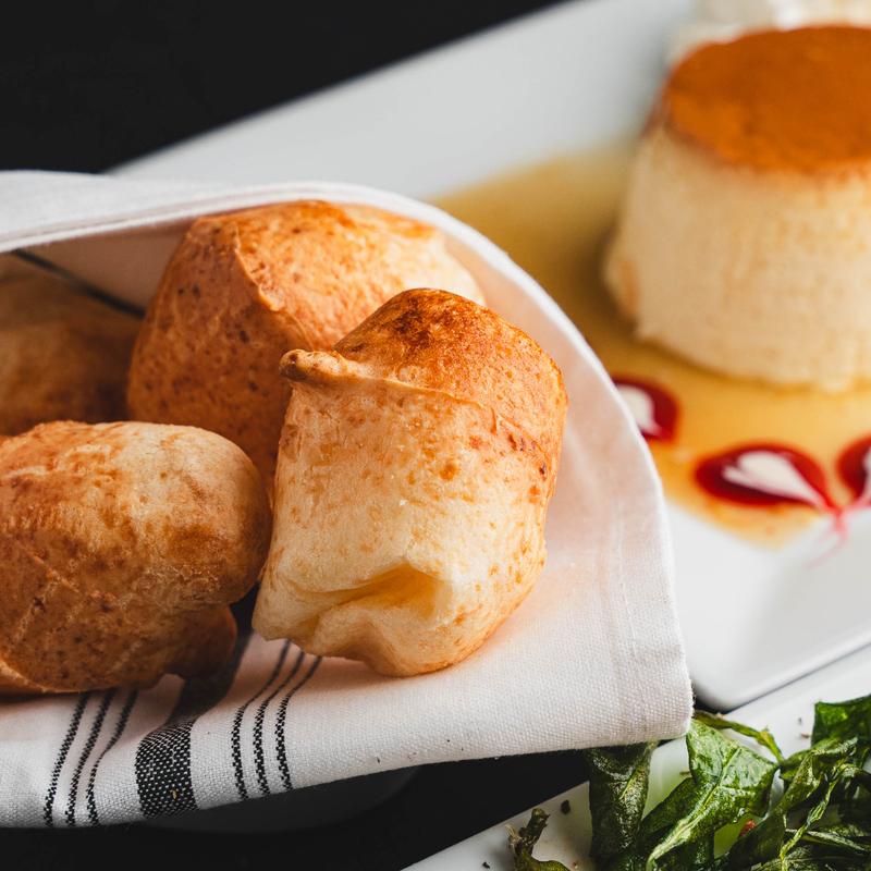 Outside skirt steak, served with rice, beans, chimichurri sauce, and pão de queijo.